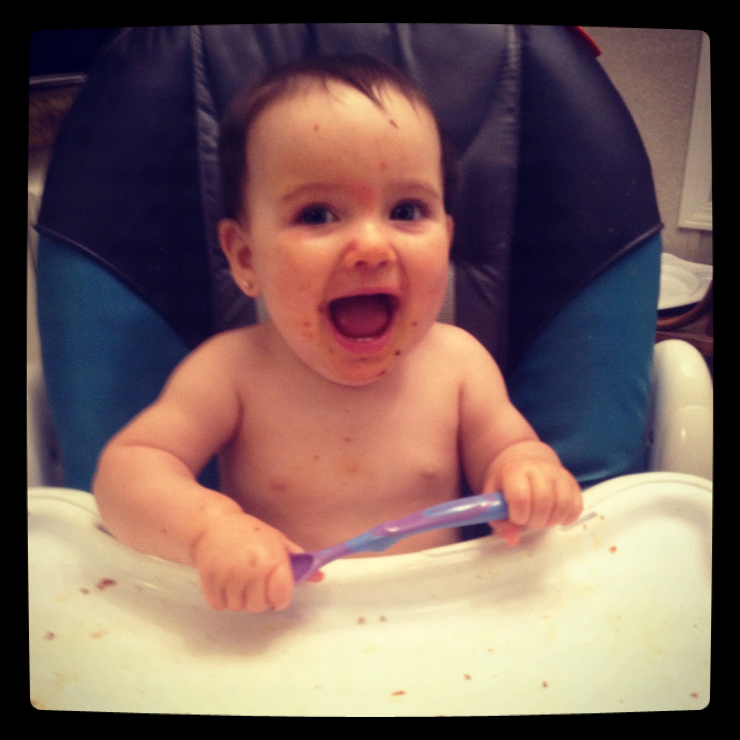 After you made nine months, we moved you to mainly table food and you LOVE it. You eat so good now that we have eliminated the baby food. You insist on feeding yourself, so at breakfast and lunch, I try to give you finger foods. At dinner I let you practice with the spoon and you do very well. You make a huge mess, which your Daddy can't stand, but I don't mind because I know that is part of it.